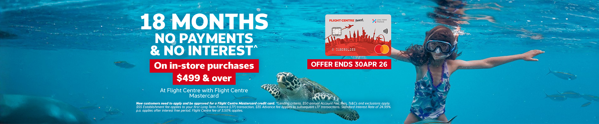 ^18 Months no payments & no interest is available on Long Term Finance (LTF) in-store purchases only at Flight Centre New Zealand between 23/02/2026 to 30/04/2026. Minimum spend $499. Lending criteria, $50 Annual Account fee, fees, Ts&Cs, and exclusions apply. Standard Interest Rate of 24.99% p.a. applies after interest free period. $55 Establishment Fee applies to your first LTF transaction, $35 Advance Fee applies to subsequent LTF transactions. Excludes foreign exchange. Other interest rates and fees may apply. A Flight Centre fee of 3.50% applies. Columbus Financial Services Limited reserves the right to amend, suspend or terminate the offer and these Ts&Cs at any time without notice. The purchase date and time is determined by when the merchant processes the purchase and is outside of the control of Columbus Financial Services Limited, which may affect eligible purchases. Flight Centre Mastercard terms and conditions (which includes any and all relevant privacy notices) apply. Credit provided by Columbus Financial Services.