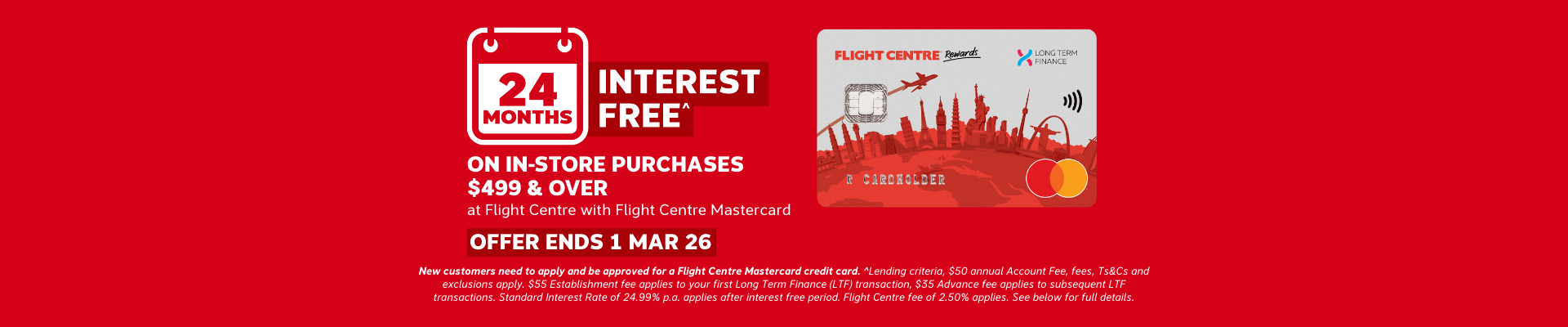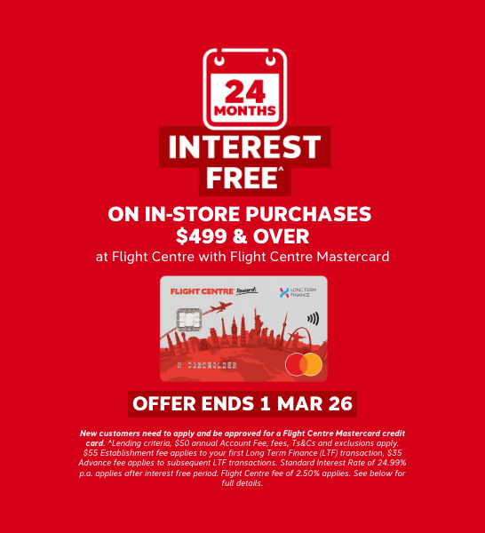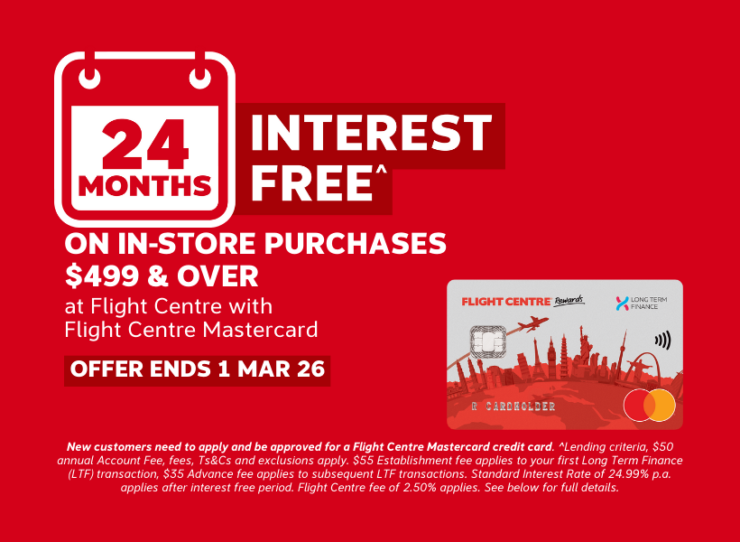 Here’s some great news! Book in your dream holiday at Flight Centre with your Flight Centre Mastercard between 19 January - 1 March 2026, and you'll enjoy 24 months interest free^ on in-store purchases $499 and over.