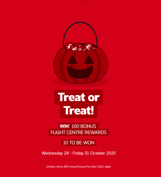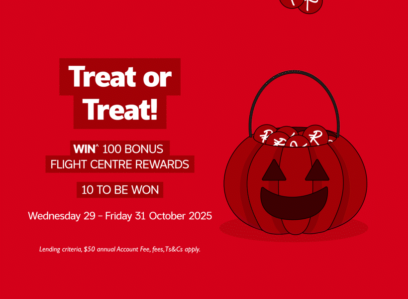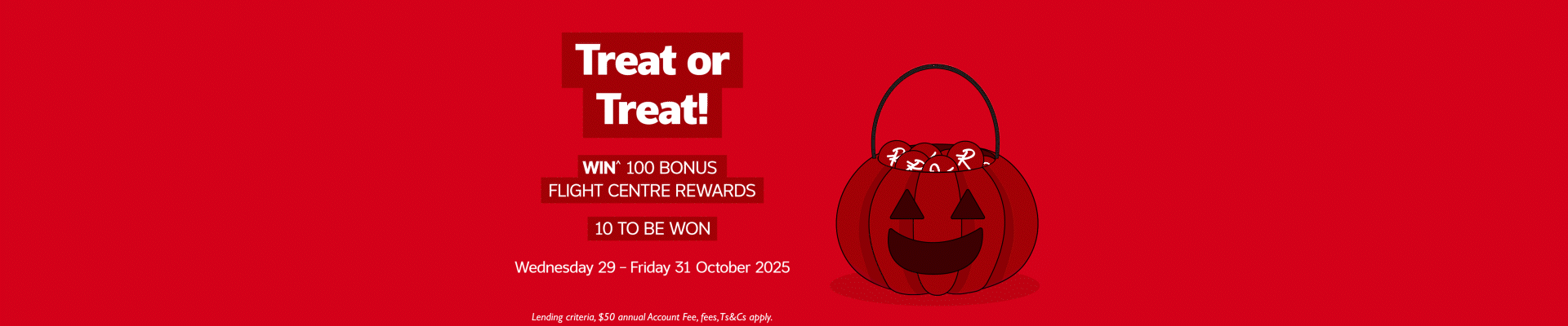 Every Flight Centre Mastercard purchase from Wednesday 29 October to Friday 31 October 2025 will put you in the draw to win^ 100 bonus Flight Centre Rewards. That’s $100 to spend at Flight Centre. We have 10 prizes to be won!